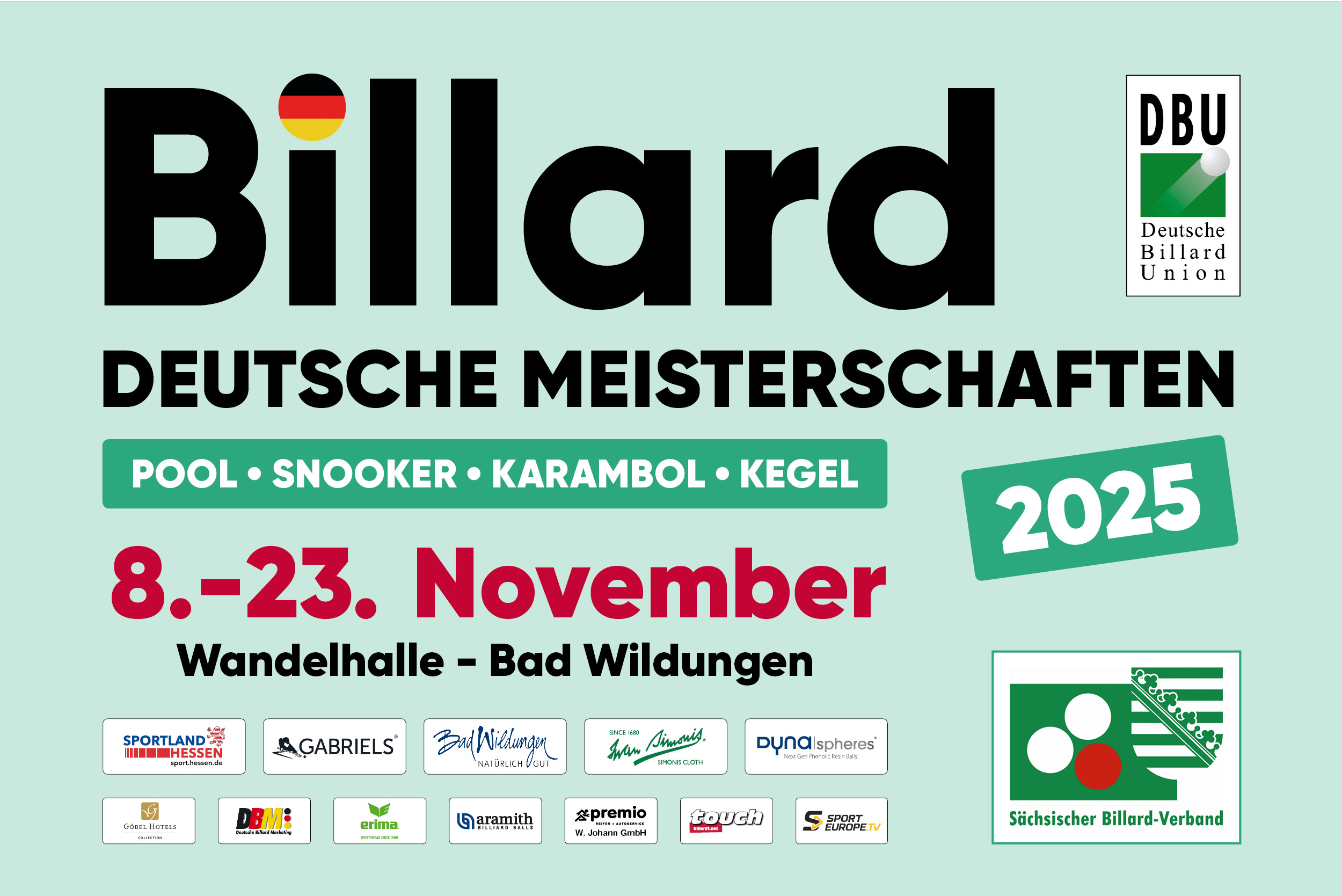 es ist mir eine besondere Freude, Sie alle zu den Zentralen Deutschen Billardmeisterschaften 2025 hier in der wunderschönen Region um Bad Wildungen ganz herzlich willkommen zu heißen. Dieses traditionsreiche Event ist seit vielen Jahren der Höhepunkt im nationalen Billardkalender – ein Fest der Präzision, der Leidenschaft und des sportlichen Miteinanders.